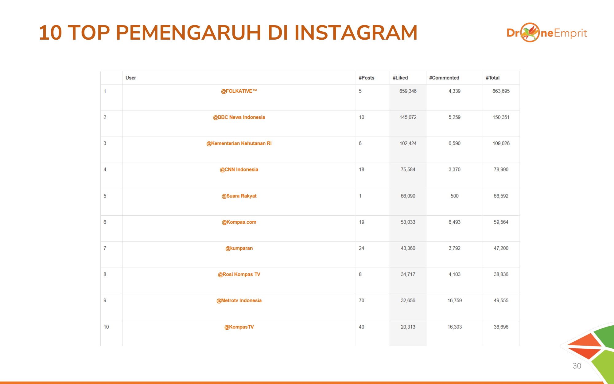 Instagram dipimpin akun agregator (@FOLKATIVE) & media berita. Menariknya, Kemenhut RI masuk top 3, indikasi bahwa klarifikasi pemerintah soal isu lingkungan dan deforestasi cukup menarik atensi publik di platform ini.