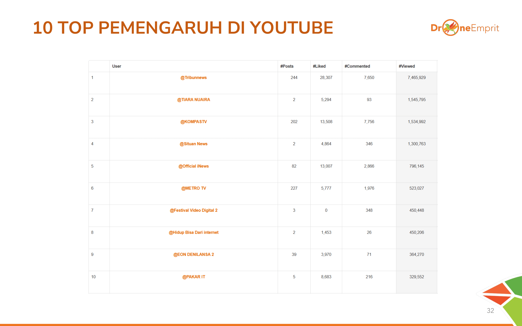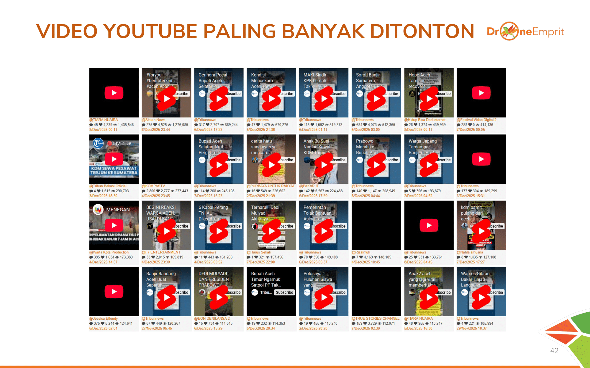 Youtube mutlak milik Media Mainstream (Tribun, KompasTV). Publik lari ke sini untuk mencari visual berita panjang & liputan mendalam pasca-bencana. Namun, munculnya kreator individu di top list sinyalkan pergeseran minat penonton.
