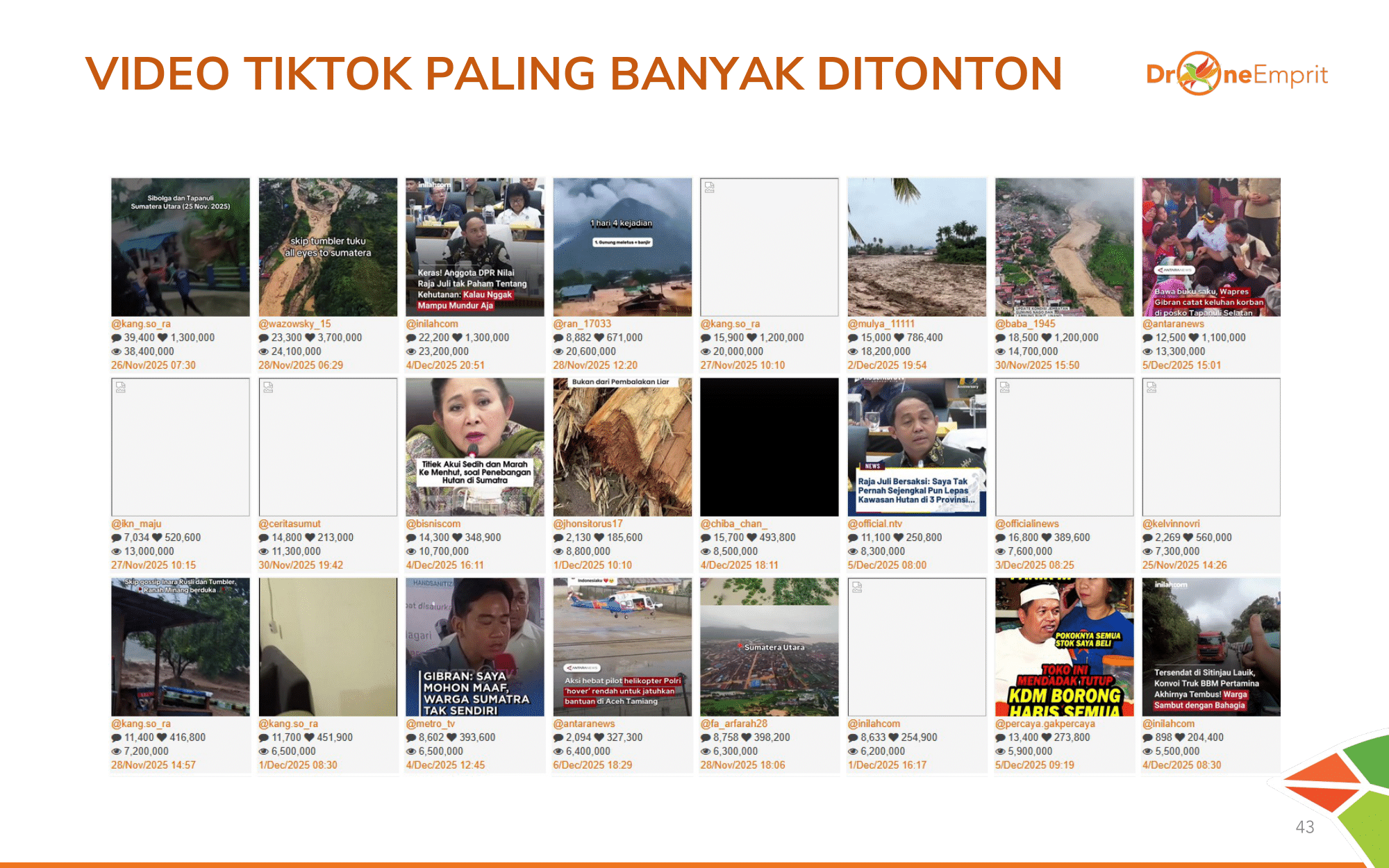 Youtube kritis soal pejabat yang dinilai abai. Uniknya, TikTok dominan positif berkat visual aksi heroik pilot helikopter & Gibran yang naik motor trail menembus lokasi isolasi. Visual berbicara lebih kuat di sini.