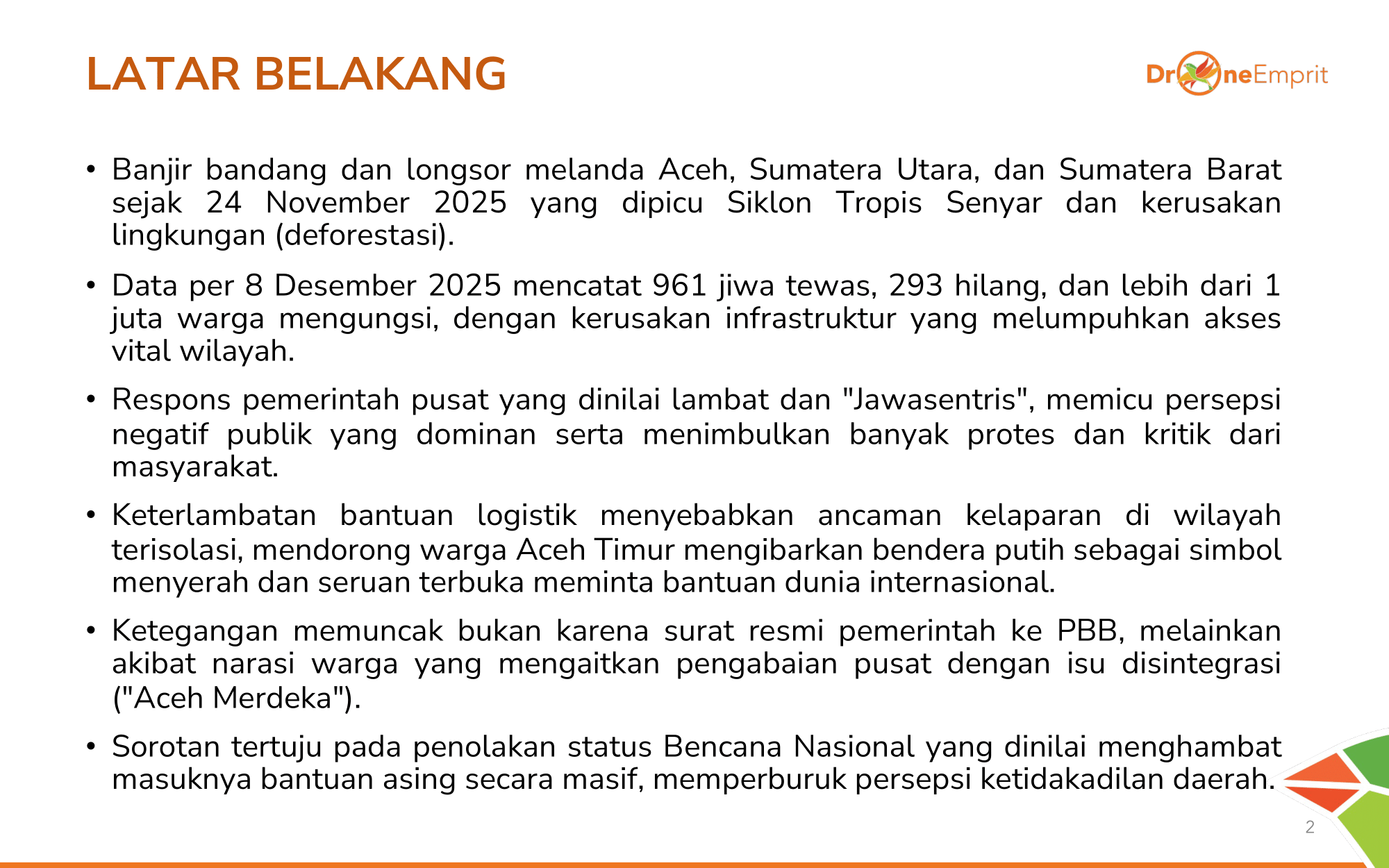 Siklon Tropis Senyar memicu banjir & longsor: ratusan jiwa tewas & 1 juta mengungsi. Respons pusat yang dinilai lamban & "Jawasentris" memicu pengibaran bendera putih hingga isu disintegrasi kembali mencuat di tengah masyarakat.