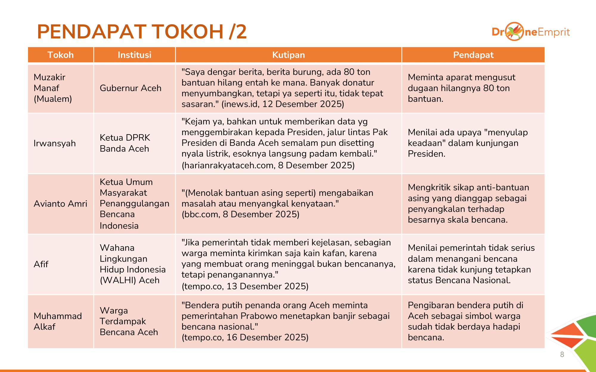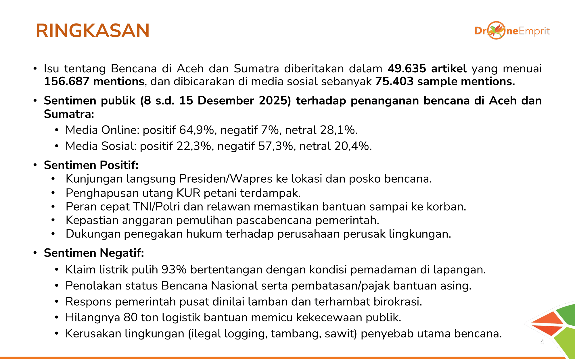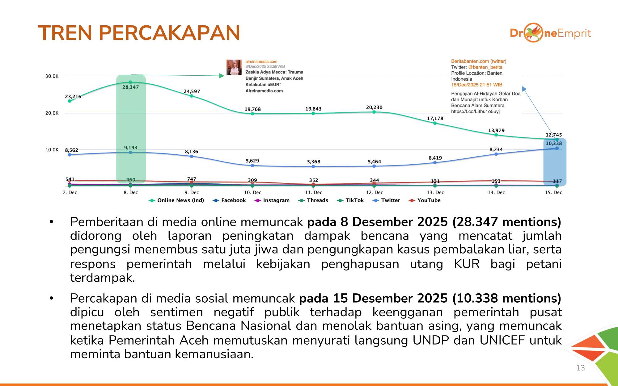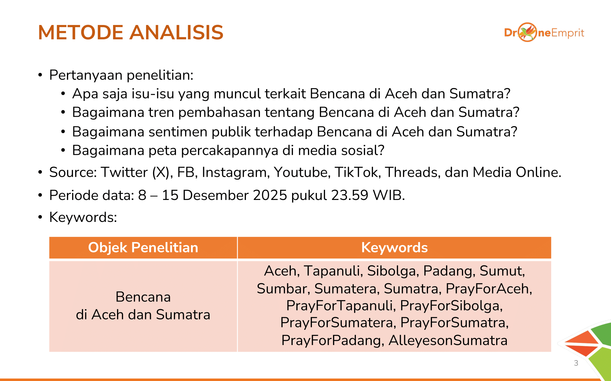 Kami memantau percakapan di 7 platform medsos & media online (8-15 Des 2025). Menggunakan keywords seperti "PrayForAceh" hingga "AlleyesonSumatra", kami memetakan sentimen & narasi publik secara komprehensif.
