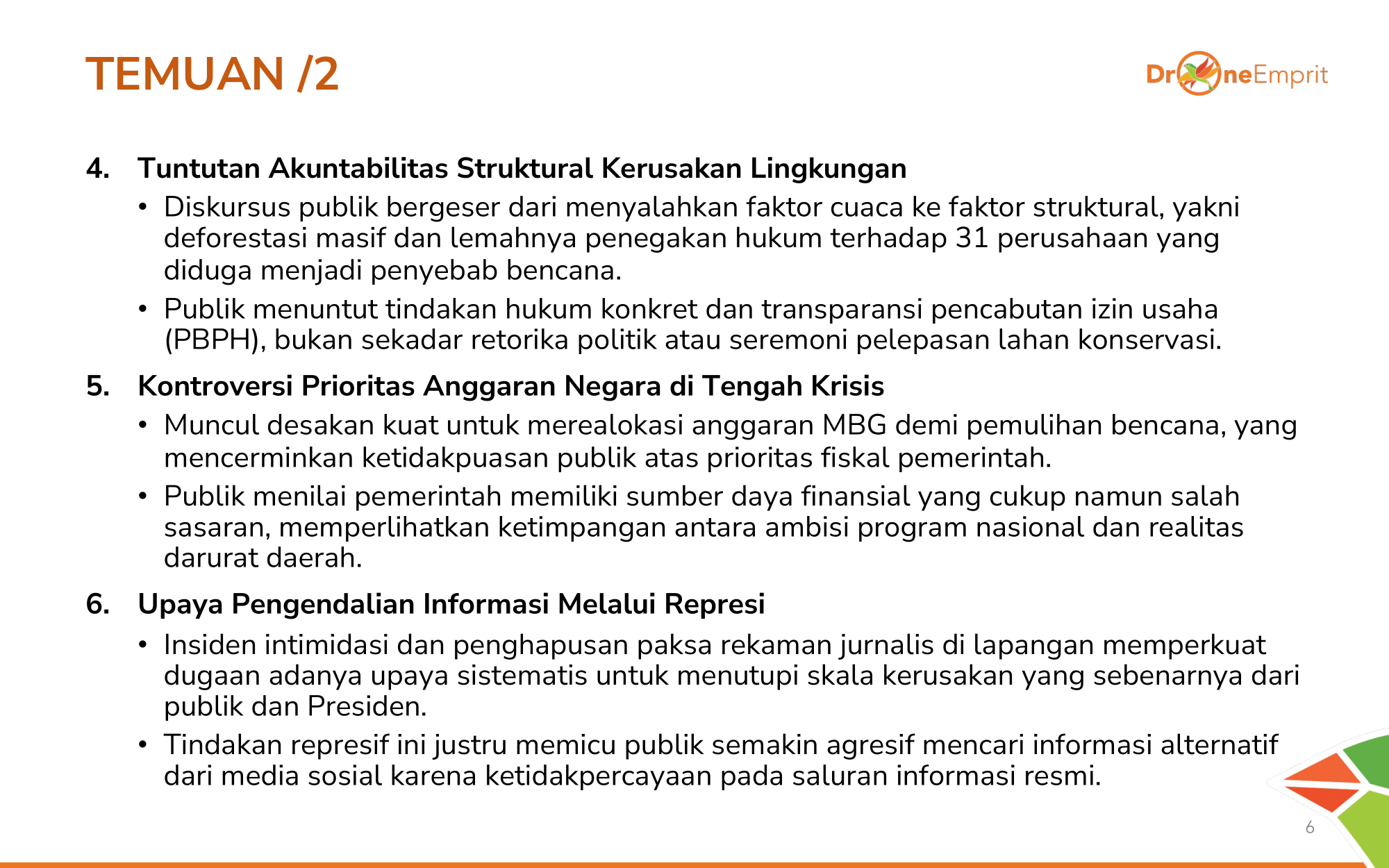 Publik mendesak hukum konkret bagi 31 perusahaan perusak hutan, bukan sekadar retorika. Desakan realokasi anggaran MBG menguat, diiringi kecaman atas intimidasi jurnalis yang dinilai sebagai upaya menutupi skala kerusakan sebenarnya dari publik & Presiden.