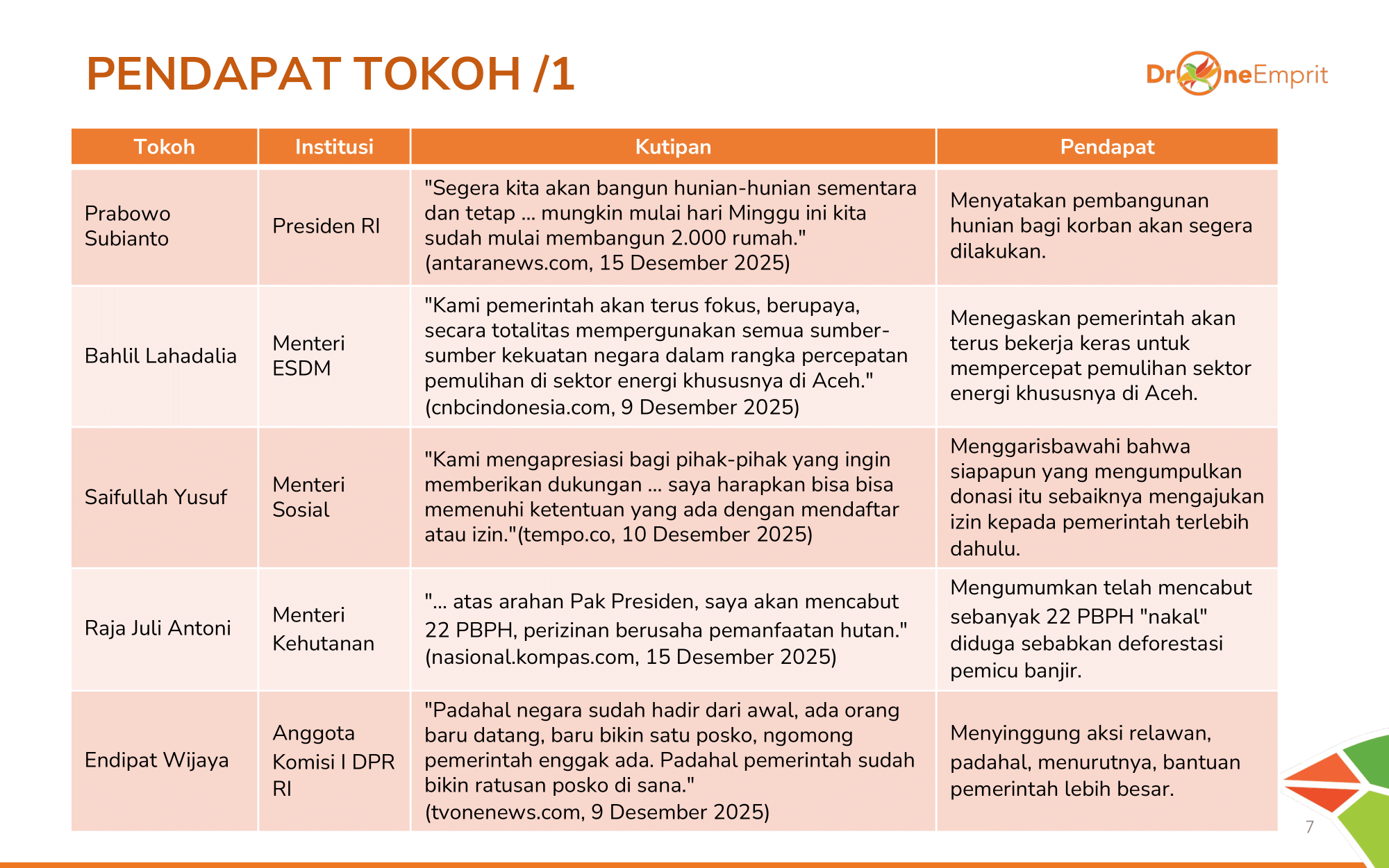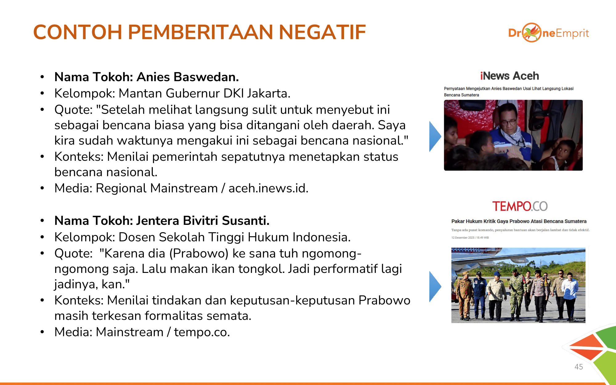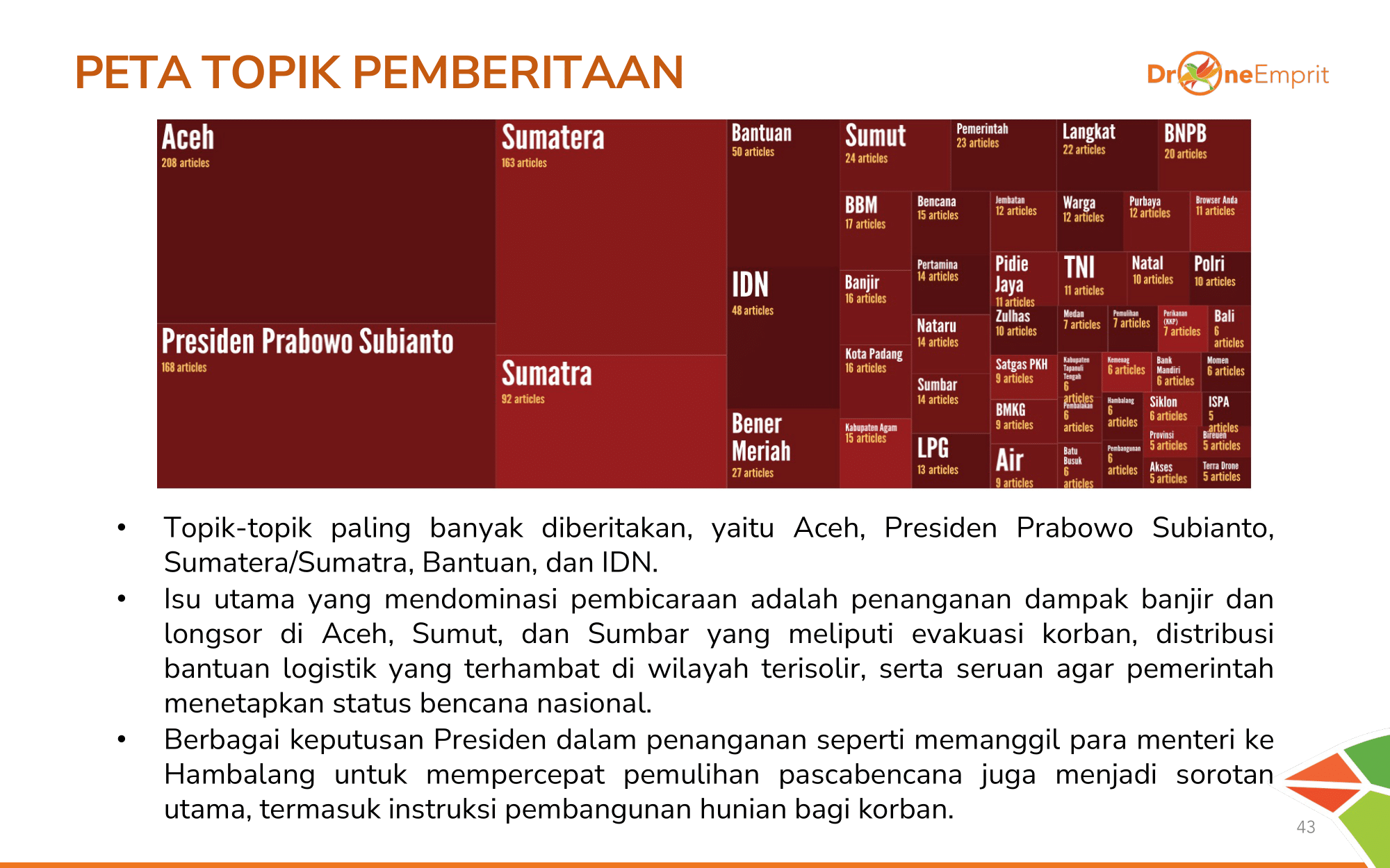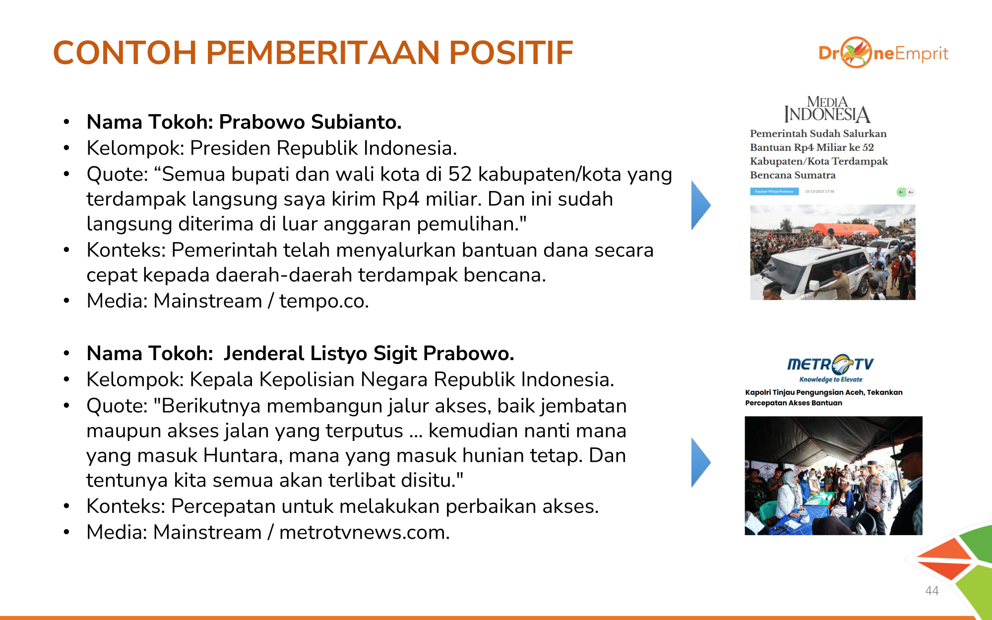 Ada apresiasi untuk gerak cepat. Presiden Prabowo disorot positif soal dana taktis 4M per daerah, & Kapolri dipuji terkait pembangunan jembatan darurat serta akses jalan yang putus oleh banjir.