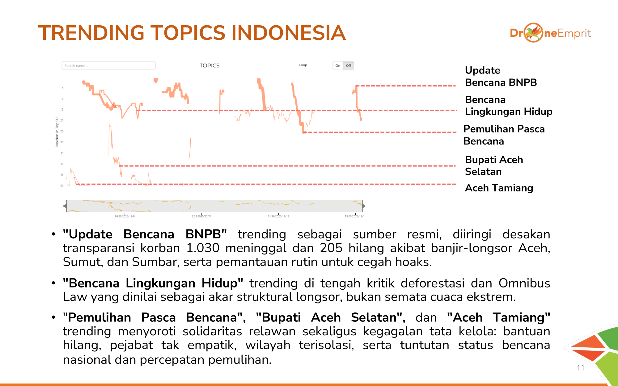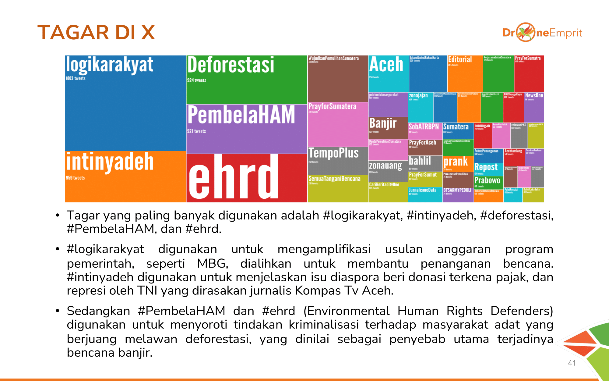 #logikarakyat trending mendesak pengalihan dana MBG ke bencana. Tagar #deforestasi & #PembelaHAM juga naik, membingkai bencana ini sebagai krisis ekologis & kegagalan negara menjaga alam.