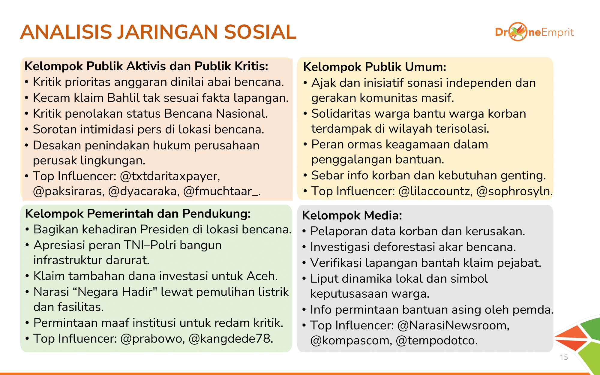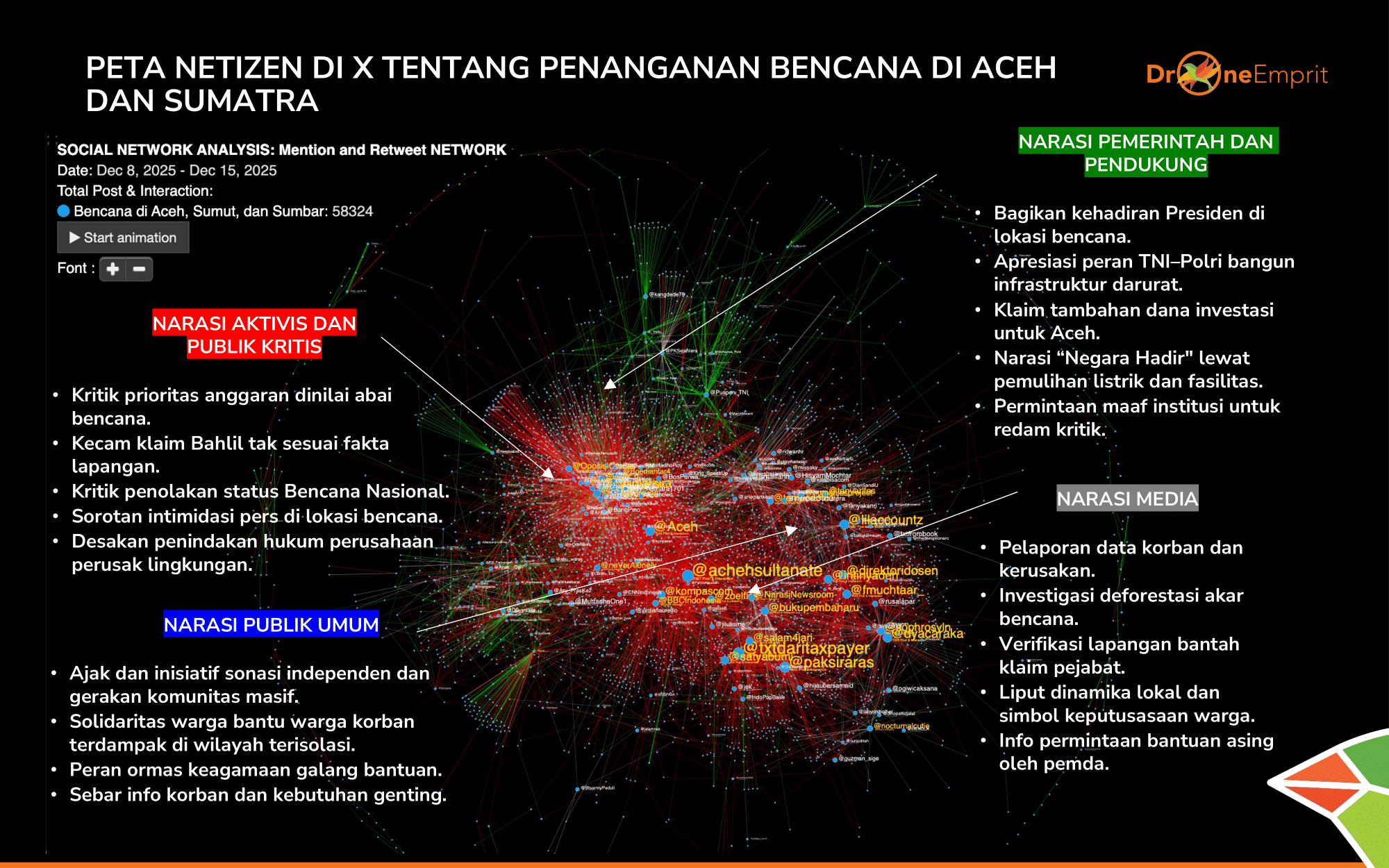 Berikut adalah visualisasi peta jaringan (SNA) percakapan di X. Terlihat polarisasi yang jelas antara klaster publik kritis, media, dan pendukung pemerintah dalam merespons bencana ini.