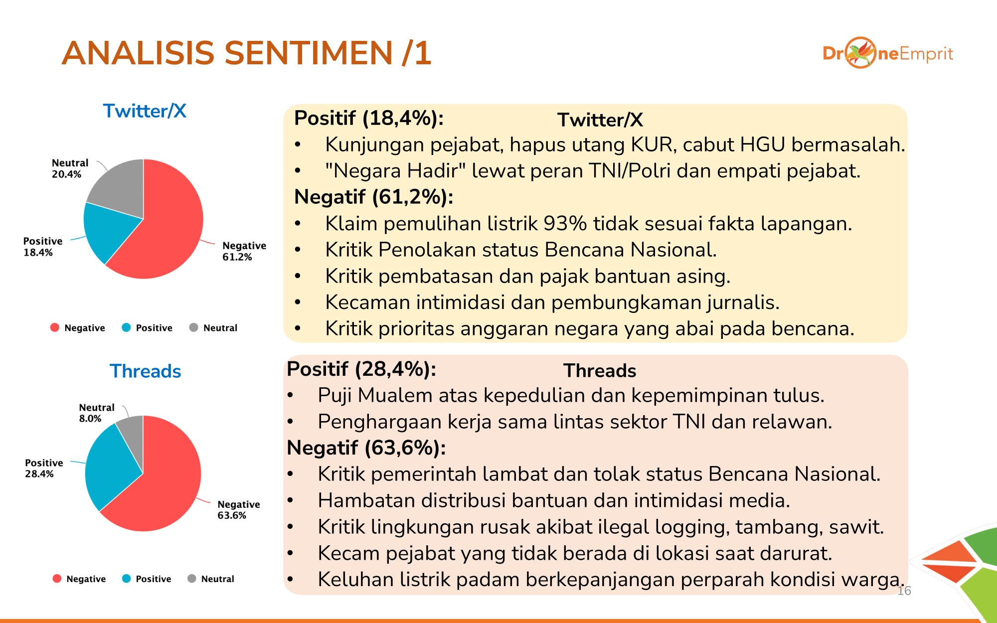 X & Threads kompak dominan negatif. Di X, isu utamanya klaim listrik palsu & pajak bantuan asing. Di Threads, user fokus kritik lambatnya respons pusat & kerusakan lingkungan akibat sawit/tambang.
