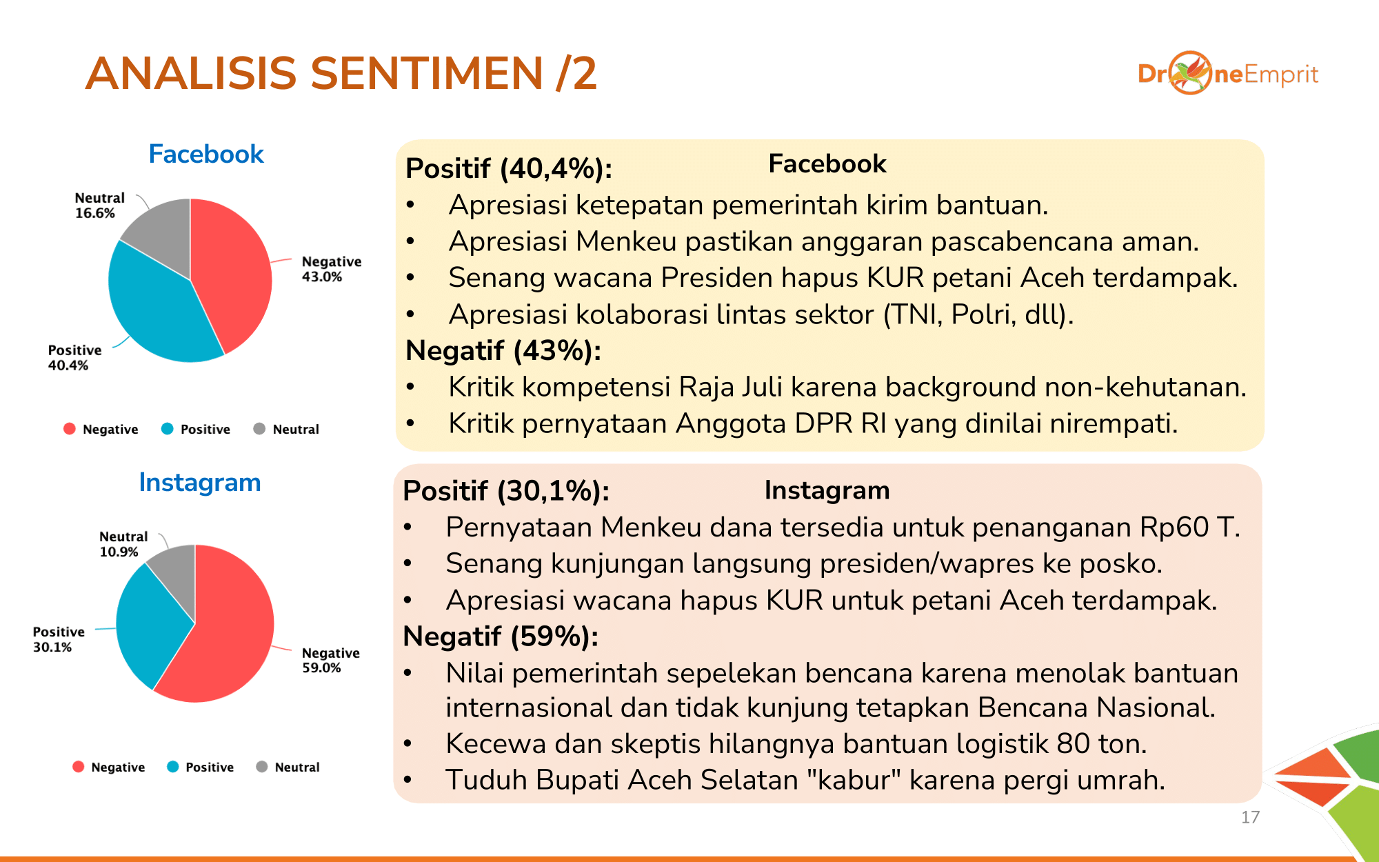 FB lebih seimbang, banyak apresiasi bantuan TNI/Polri. Namun Instagram tetap keras, kecewa soal bantuan logistik 80 ton yang hilang & isu pejabat daerah yang pergi umrah saat krisis.