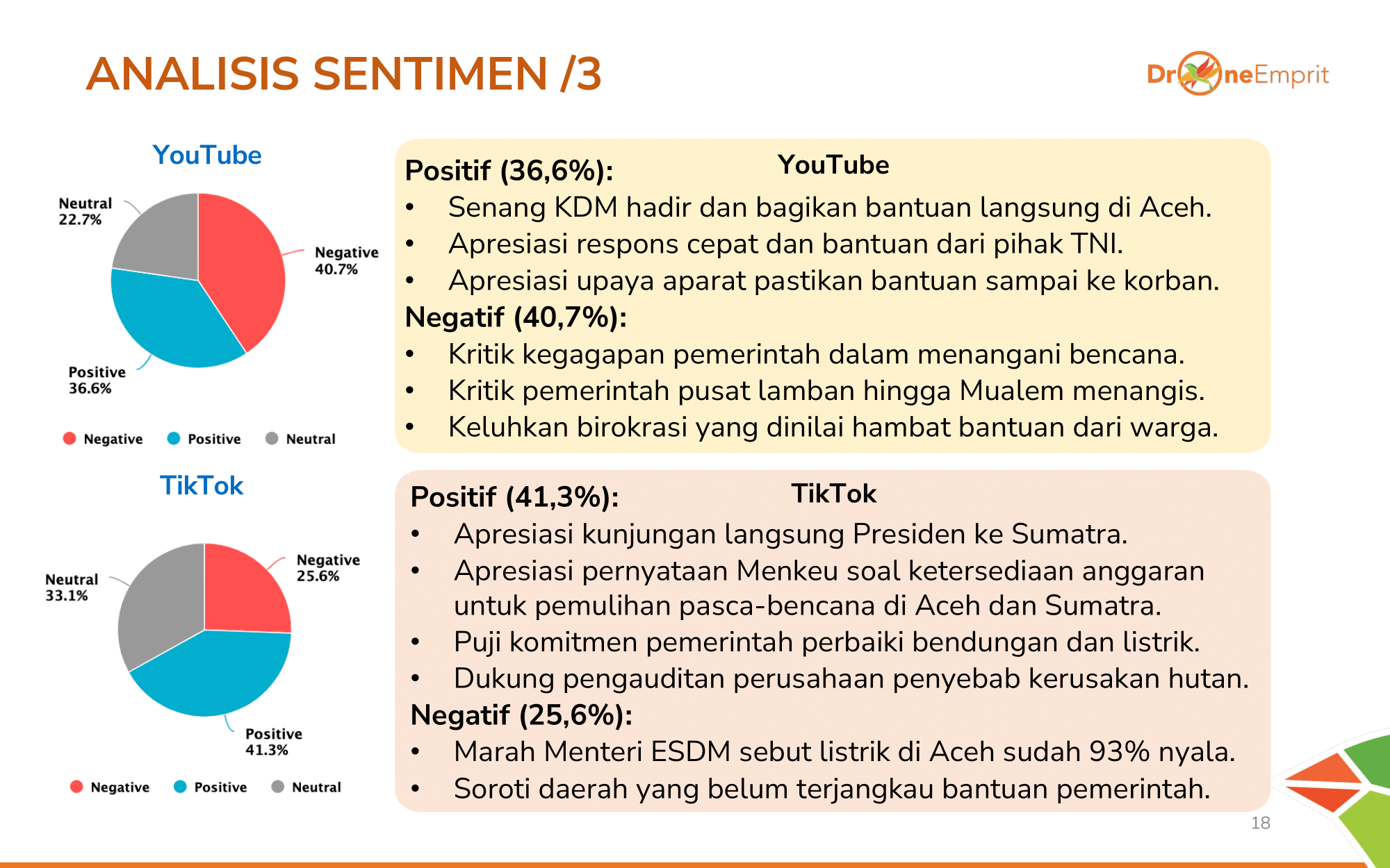 YouTube cenderung negatif soroti birokrasi lamban. Uniknya, TikTok jadi platform paling positif, banyak apresiasi kunjungan Presiden, bantuan Menkeu, & janji audit perusahaan perusak hutan.