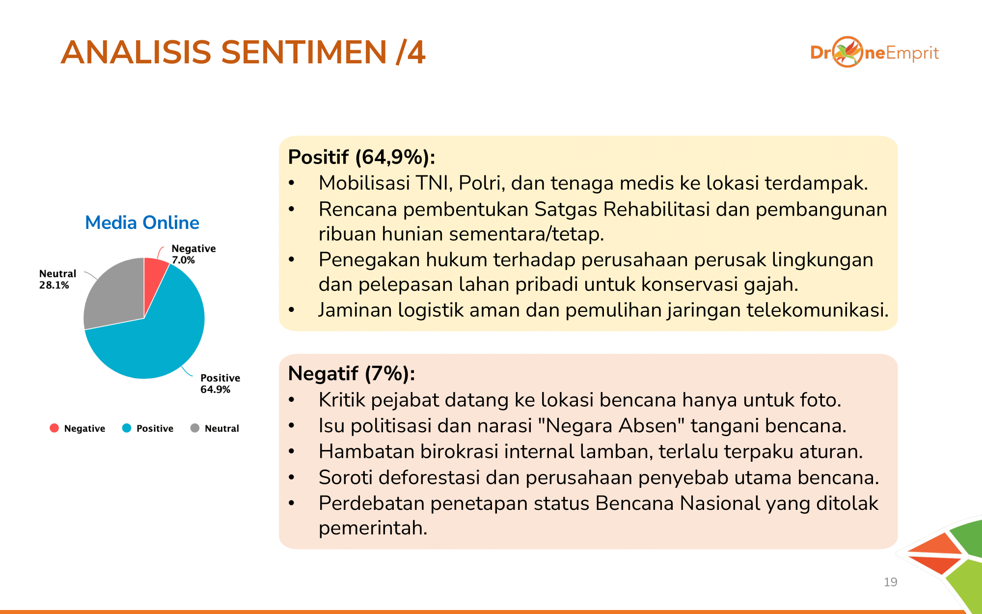 Media Online menjadi penyeimbang utama dengan sentimen positif 64,9%. Framing berita fokus pada mobilisasi aparat, rencana Satgas Rehabilitasi, & penegakan hukum lingkungan. Hanya sedikit yang bernada negatif.