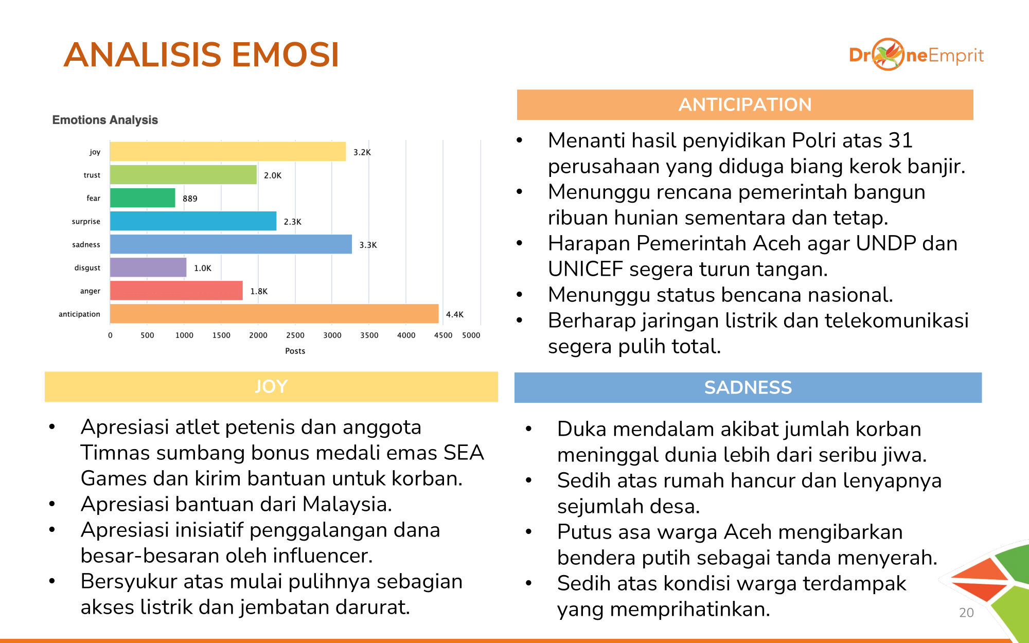 Bercampur aduk. 'Sadness' mendalam atas korban jiwa & keputusasaan (bendera putih). 'Anticipation' menunggu janji hunian & hukum. Namun ada 'Joy' yang tumbuh dari solidaritas atlet & relawan independen.