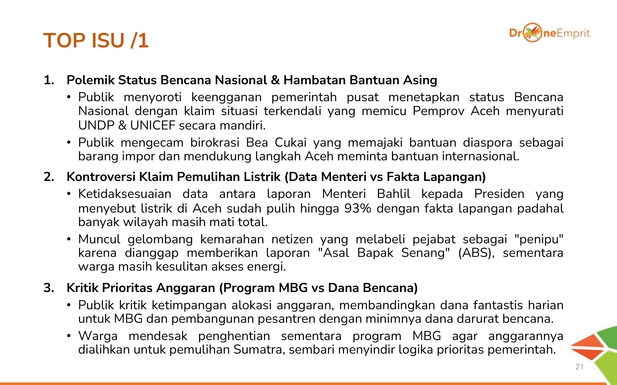Polemik pajak bantuan diaspora & surat Aceh ke PBB jadi sorotan utama. Ditambah amarah netizen soal klaim listrik "Asal Bapak Senang" & desakan pengalihan dana MBG untuk darurat bencana ketimbang program lain.