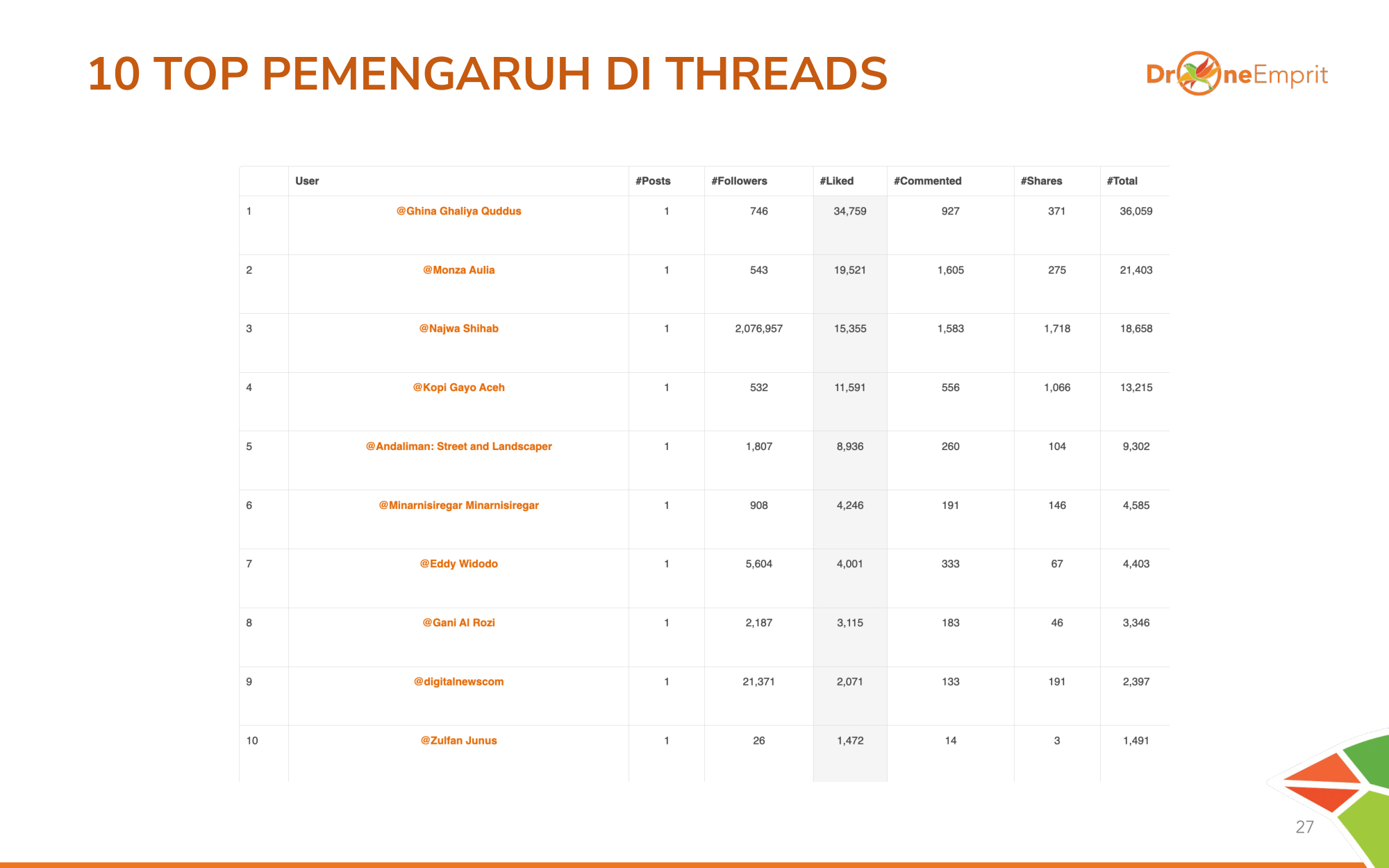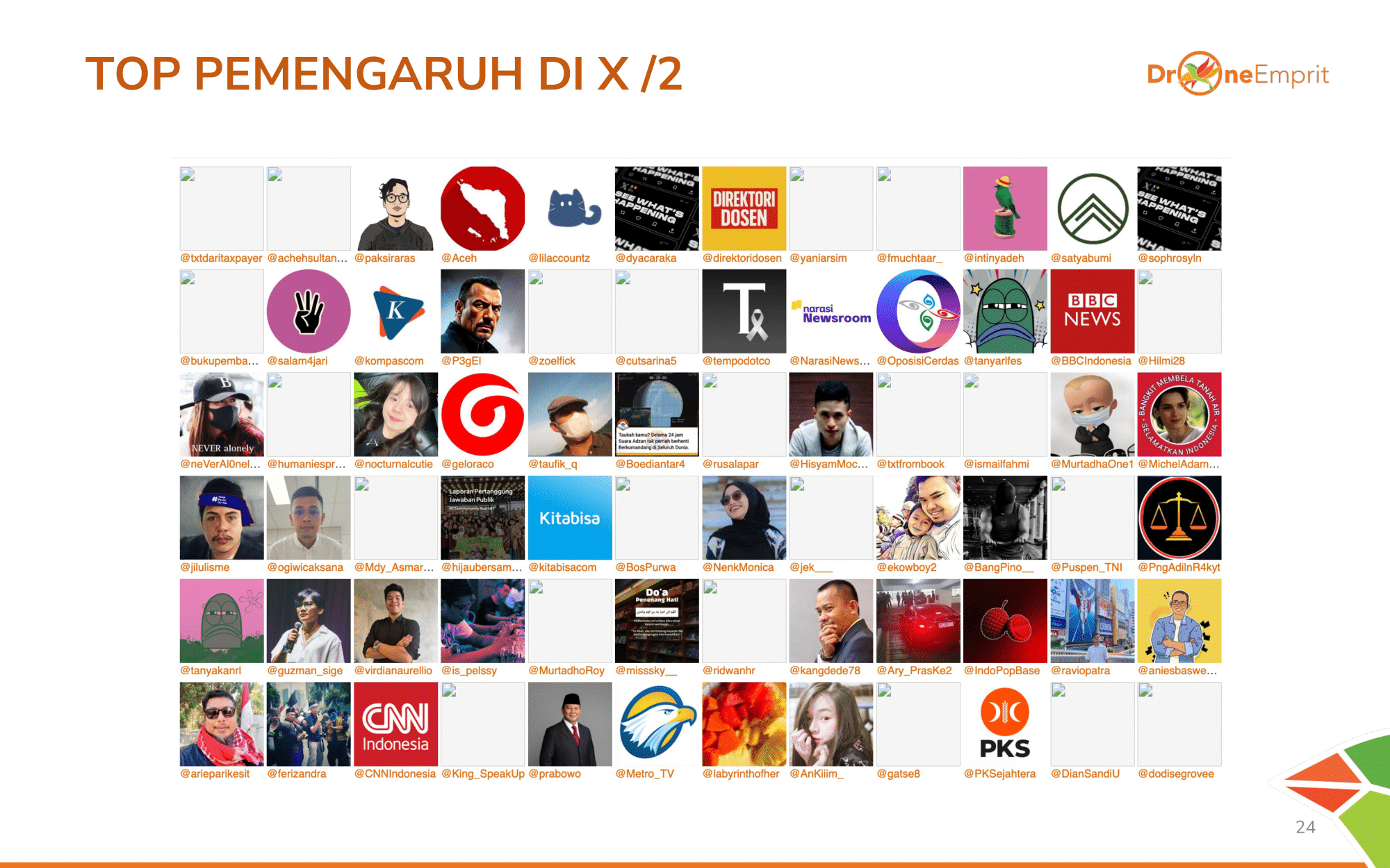 Berikut adalah daftar lanjutan akun-akun yang paling berpengaruh dalam menggerakkan percakapan di platform X terkait bencana ini. Adakah akun yang sering lewat di timeline kalian?