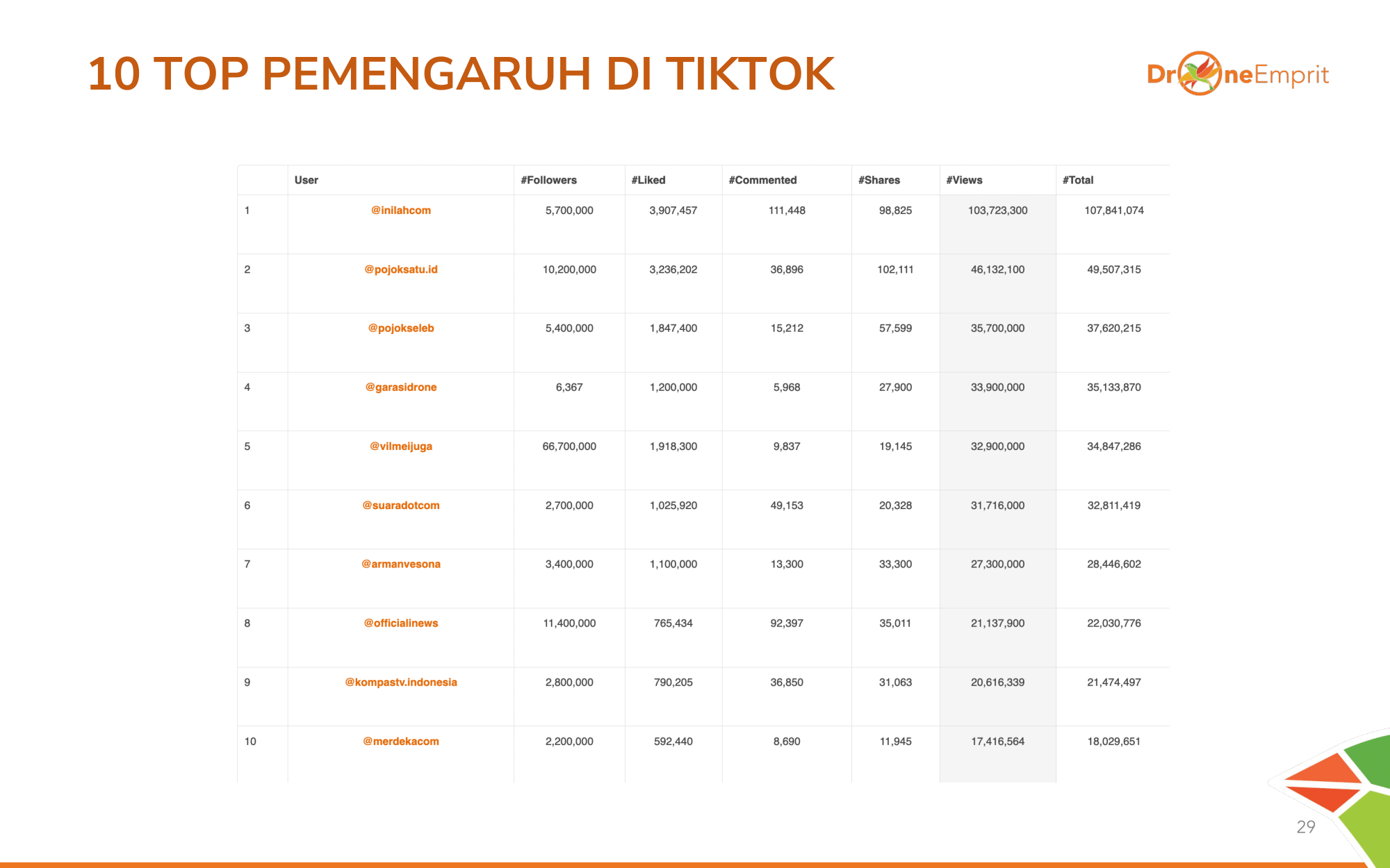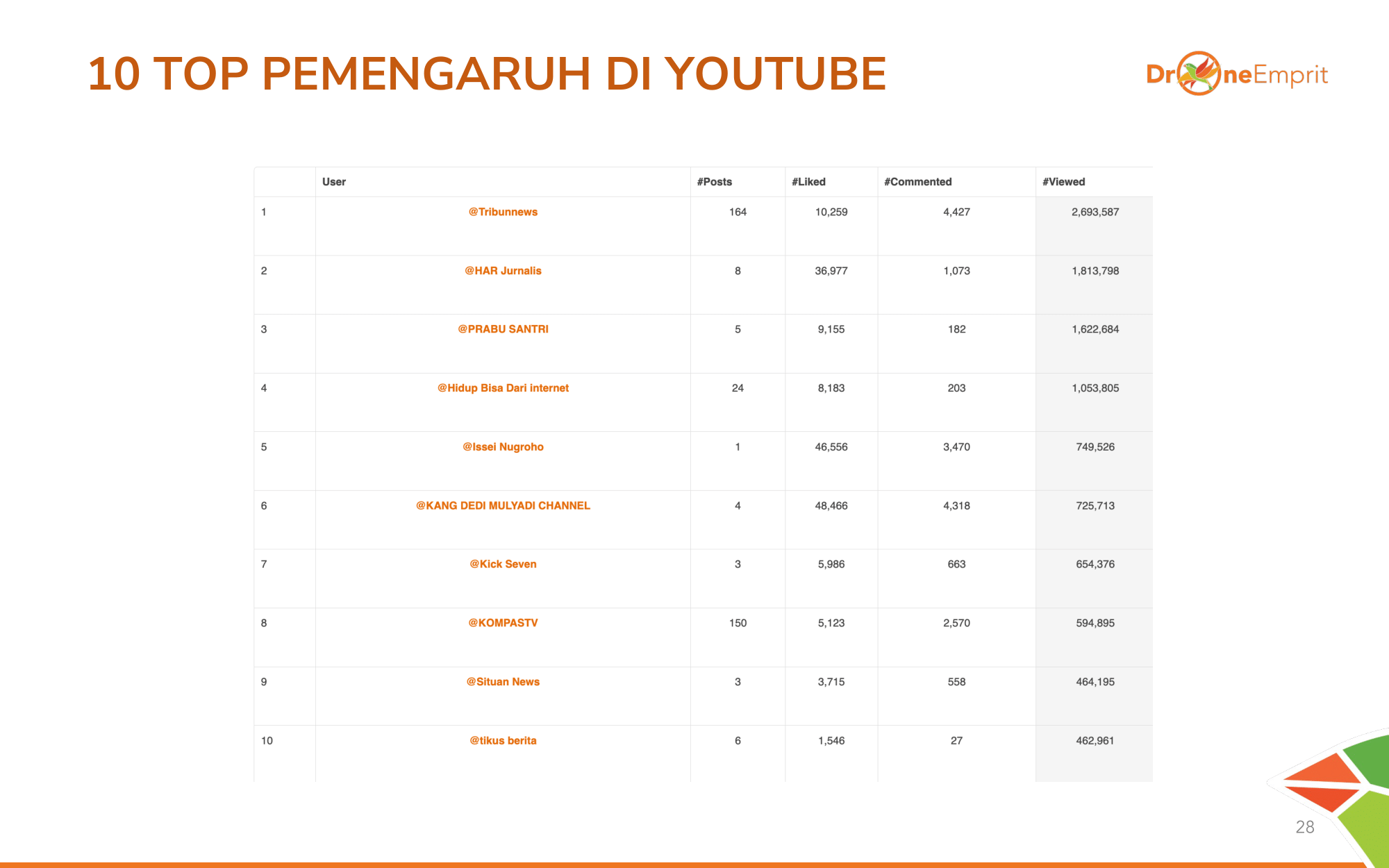 Instagram dikuasai akun media pop (Folkative), berita internasional (BBC), hingga seleb (Raffi Ahmad). Gerakan sosial seperti @GerakanTurunTangan juga masuk dalam top list penggerak opini.