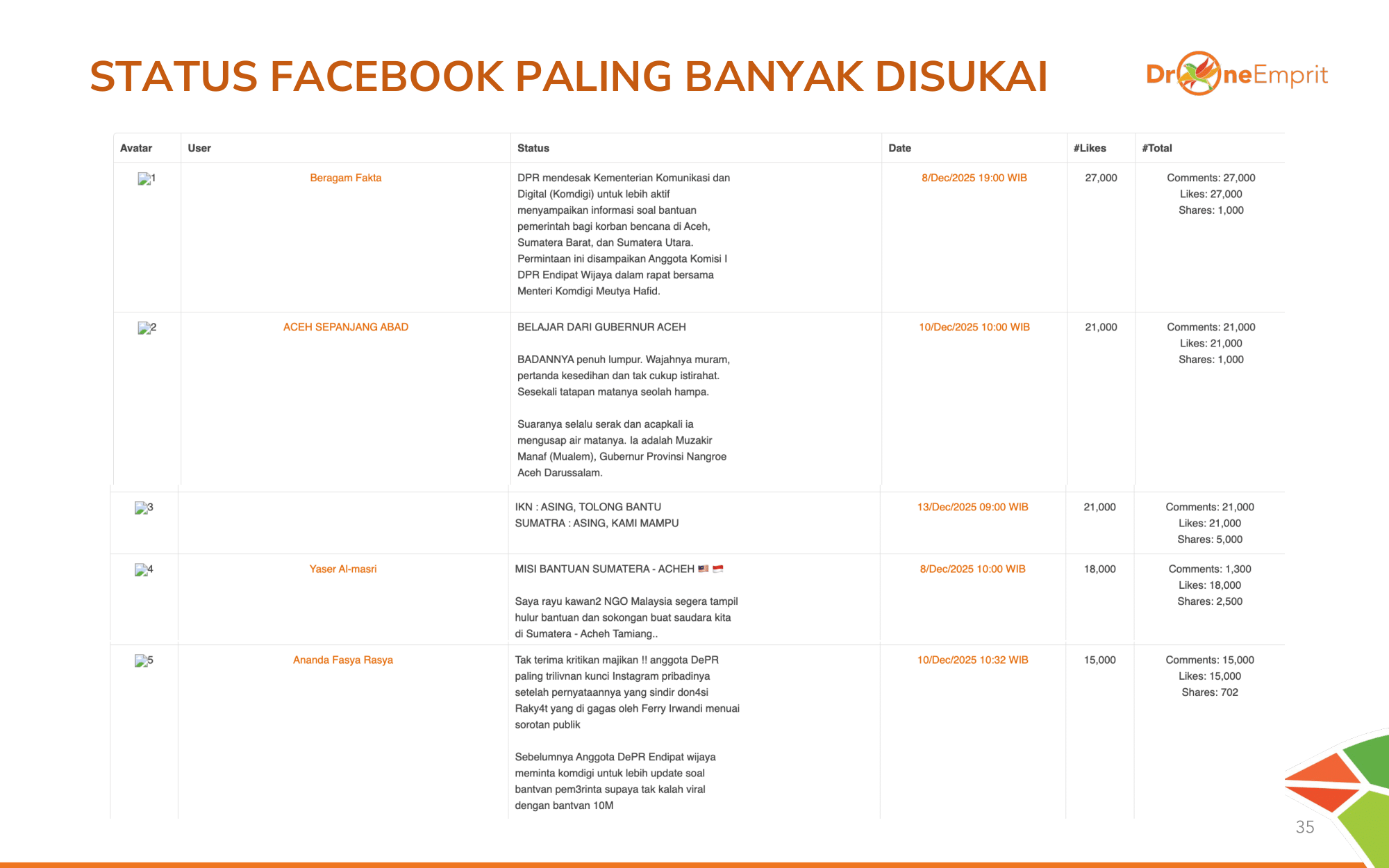 Di Facebook, narasi lebih emosional & suportif. Kisah Gubernur Mualem yang menangis, hingga solidaritas bantuan dari Malaysia & akun lokal "Aceh Sepanjang Abad" mendominasi timeline warga.