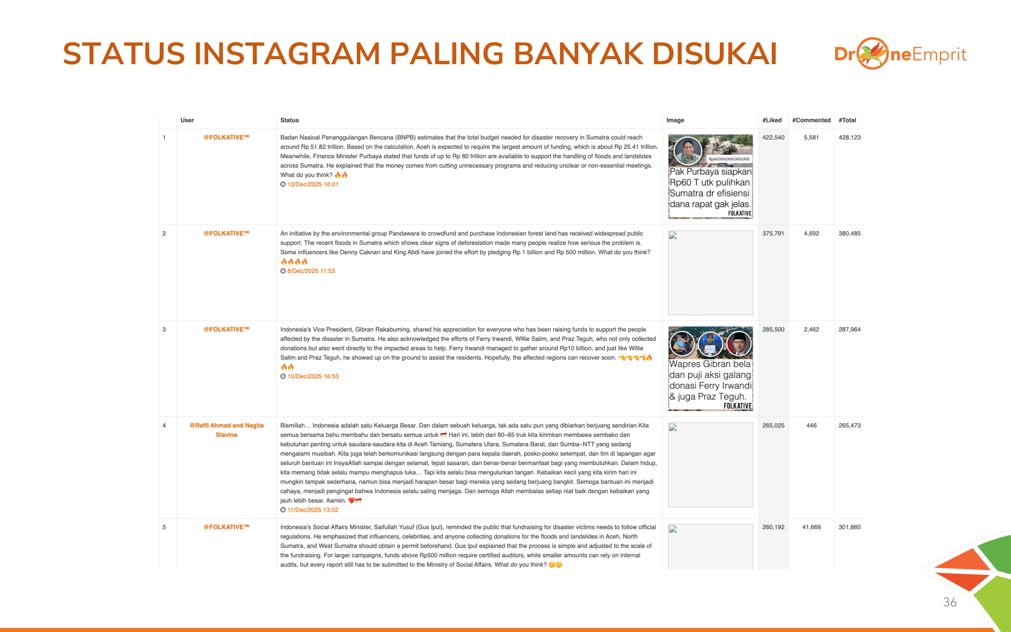 Akun media pop @FOLKATIVE & seleb @RaffiNagita1717 memimpin. Narasi "Indonesia Keluarga Besar" & aksi galang dana influencer dapat atensi masif, jauh mengungguli postingan akun resmi pemerintah.