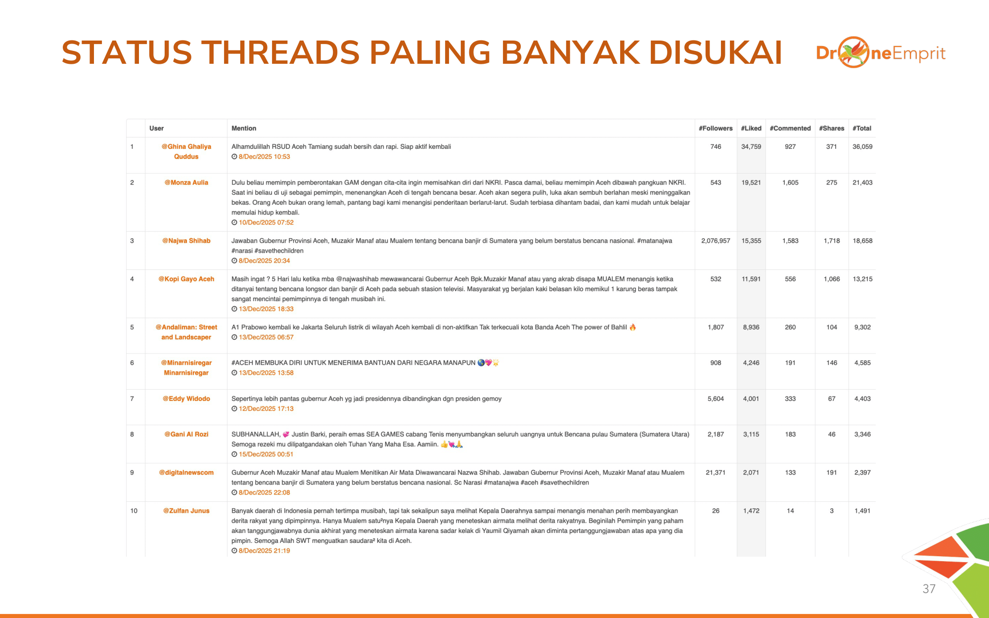 Di Threads, jurnalis seperti Najwa Shihab & akun personal vokal seperti Ghina Ghaliya menjadi rujukan utama diskusi yang lebih mendalam & kritis mengenai penanganan bencana.