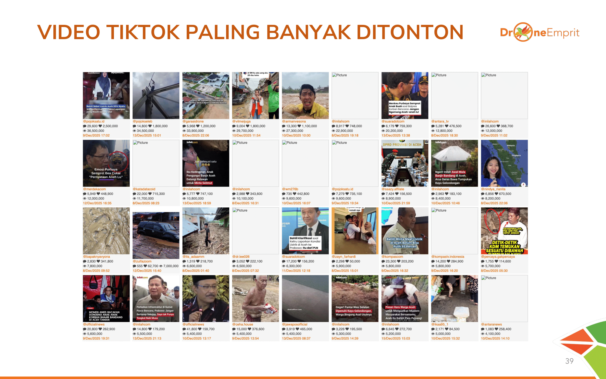 Media online (Inilahcom, Pojoksatu) bersaing ketat dengan kreator konten viral (Vilmei) dalam menyebarkan potongan video kondisi bencana & penyaluran bantuan di TikTok.